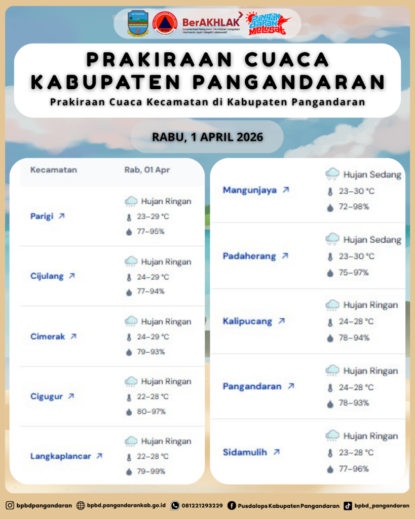 LAPORAN HARIAN PUSDALOPS PB BADAN PENANGGULANGAN BENCANA DAERAH KABUPATEN PANGANDARAN A. Waktu : Rabu, 1 April 2026. Pukul : 06.00 WIB. B. Kejadian Bencana : NIHIL C. Prakiraan Cuaca : – Parigi : Hujan Ringan 🌡️ 23–29 °C, 💧77–95% – Cijulang : Hujan Ringan 🌡️ 24–29 °C, 💧77–94% – Cimerak : Hujan […]