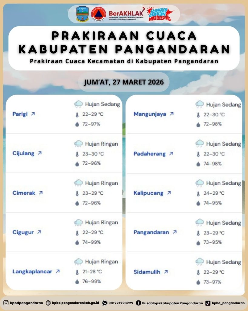 LAPORAN HARIAN PUSDALOPS PB KAB. PANGANDARAN BADAN PENANGGULANGAN BENCANA DAERAH KAB. PANGANDARAN A. Waktu : Sabtu, 28 Maret 2026 Pukul 06.00 WIB. B. Kejadian Bencana : NIHIL C. Prakiraan Cuaca : – Parigi: Hujan Ringan, 🌡️23–29°C, 💧75–97% – Cijulang: Hujan Ringan, 🌡️24–29°C, 💧75–95% – Cimerak: Hujan Ringan, 🌡️24–29°C, 💧74–95% – Cigugur: Hujan […]