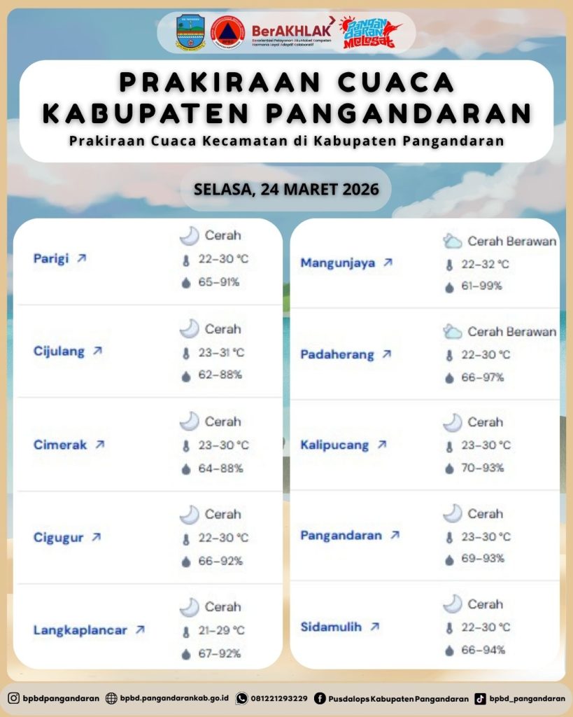 LAPORAN HARIAN PUSDALOPS PB KAB. PANGANDARAN BADAN PENANGGULANGAN BENCANA DAERAH KAB. PANGANDARAN A. Waktu : Rabu, 25 Maret 2026 Pukul 06.00 WIB. B. Kejadian Bencana : NIHIL C. Prakiraan Cuaca : – Parigi: Hujan Ringan, 🌡️23–32°C, 💧70–96% – Cijulang: Berawan, 🌡️24–32°C, 💧68–95% – Cimerak: Berawan, 🌡️24–31°C, 💧70–92% – Cigugur: Hujan Ringan, 🌡️22–31°C, […]
