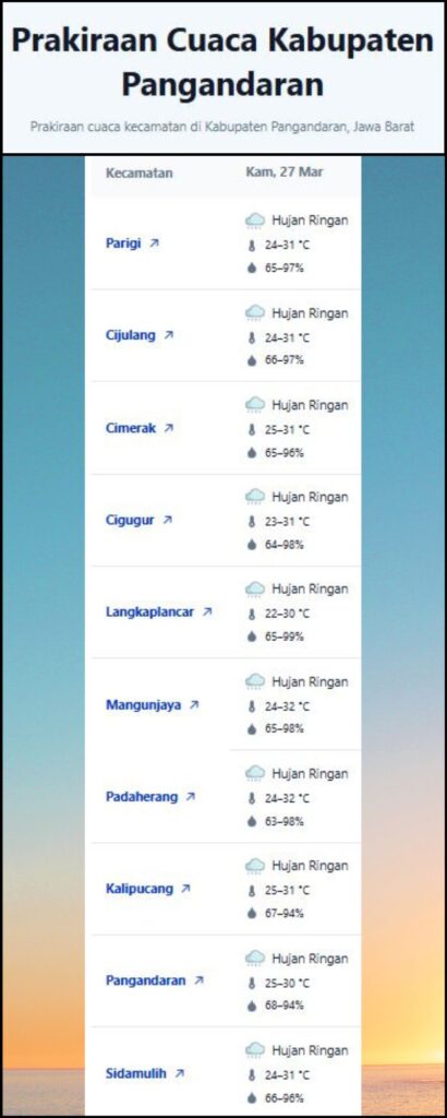 Laporan Harian & Prakiraan Cuaca Kabupaten Pangandaran – Kamis, 27 Maret 2025.