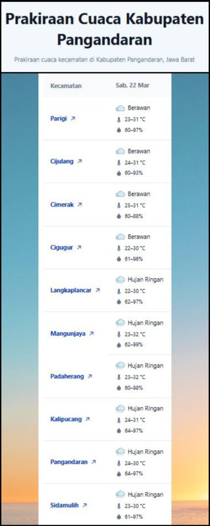 Laporan Harian & Prakiraan Cuaca Kabupaten Pangandaran – Sabtu, 22 Maret 2025.