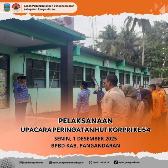 BPBD Kabupaten Pangandaran telah melaksanakan Upacara peringatan Hari Ulang Tahun ke-54 KORPRI, Senin, 1 Desember 2025 pukul 07.30 WIB. Kegiatan ini dilaksanakan berdasarkan Surat Edaran