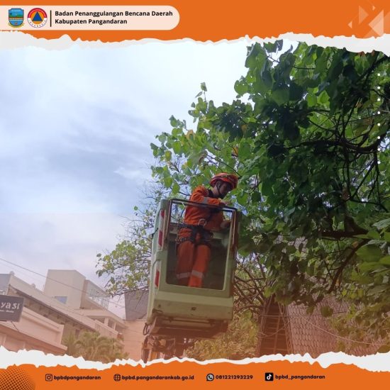 BPBD Kabupaten Pangandaran berkolaborasi bersama Dinas Perhubungan Kabupaten Pangandaran melaksanakan kegiatan pemangkasan pohon yang menghalangi penerangan Lampu Penerangan Jalan Umum (PJU) di wilayah pantai.